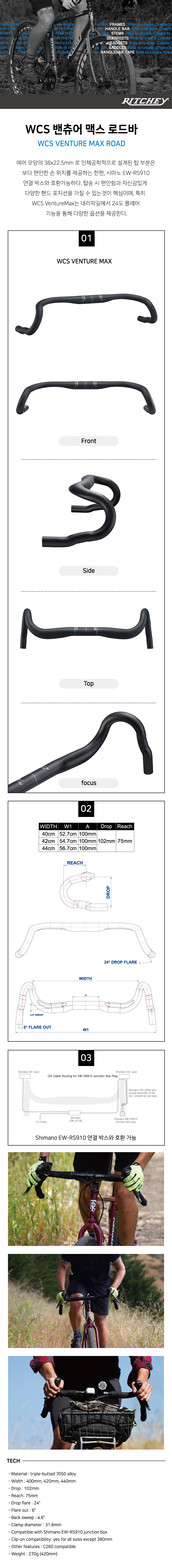 리치 WCS 벤츄어 맥스 로드 자전거 핸들바 40cm,42cm,44cm 드롭바