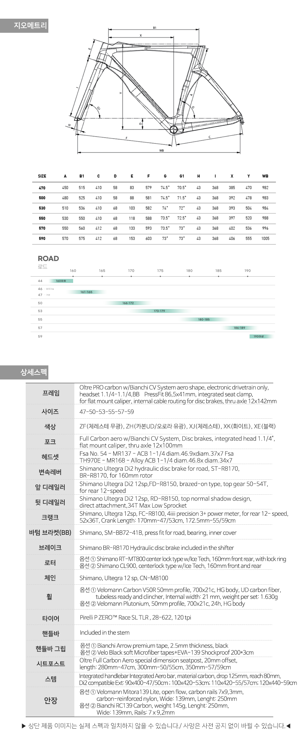 > 비앙키 올트레 PRO 울테그라 DI2 풀 카본 에어로 24단 로드 자전거