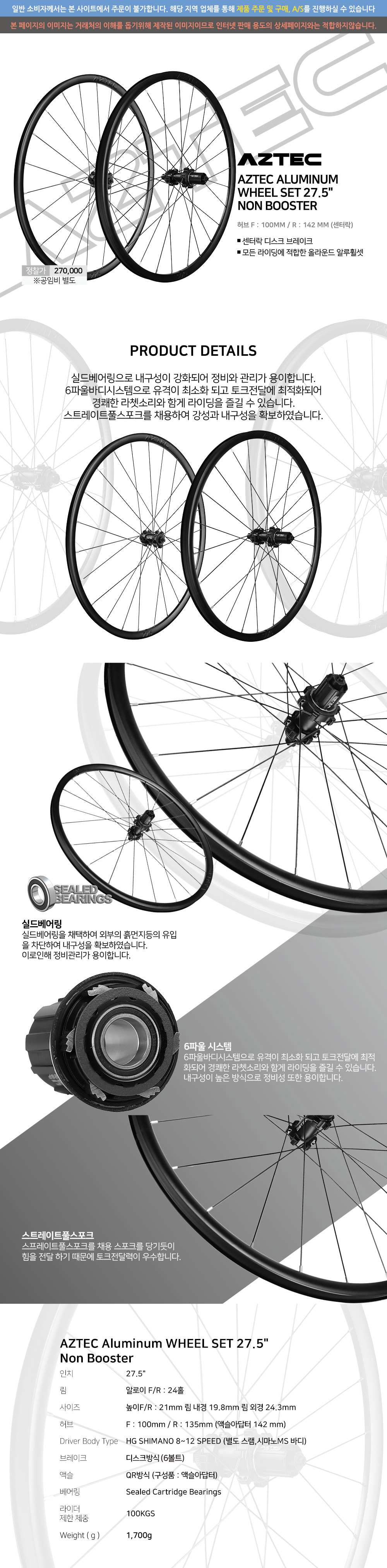 아즈텍 휠셋 6볼트 디스크 브레크 방식 MTB 27.5인치 논부스터